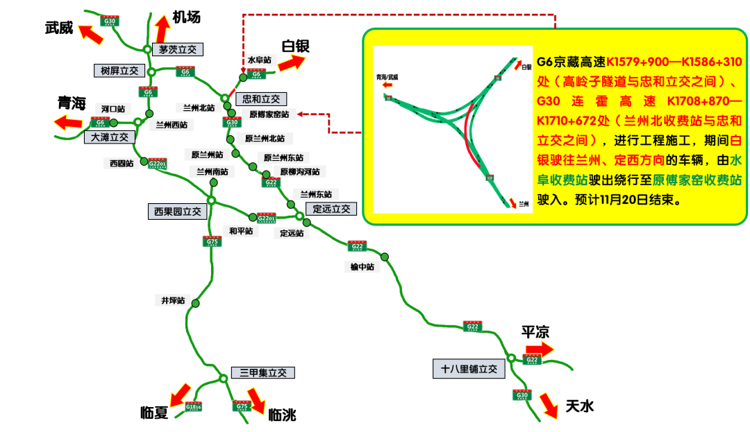 ●G6京藏高速K1579+900—K1586+310处(高岭子隧道与忠和立交之间)、G30连霍高速K1708+870—K1710+672处(兰州北收费站与忠和立交之间),进行工程施工,期间白银驶往兰州、定西方向的车辆,由水阜收费站驶出绕行至原傅家窑收费站驶入。请途经车辆合理规划出行路线,注意行车安全。预计11月25日结束。