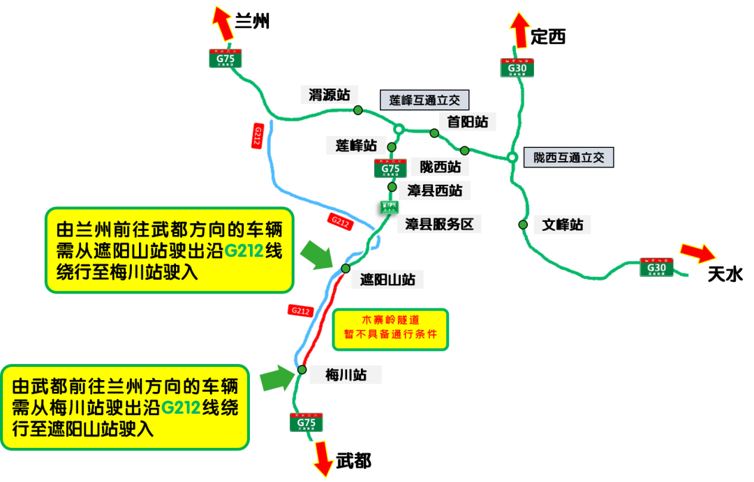 ●G75兰海高速渭武段,因遮阳山站至梅川站暂未开通,过往车辆需由临近收费站(遮阳山站、梅川站)驶出绕行。