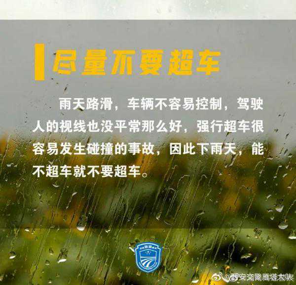 雨水天气,有出行需求的朋友请留意天气、路况信息,避开受恶劣天气影响的时段和路段,雨天路滑请谨慎驾驶!滑动查看《雨天行车安全》手册↓