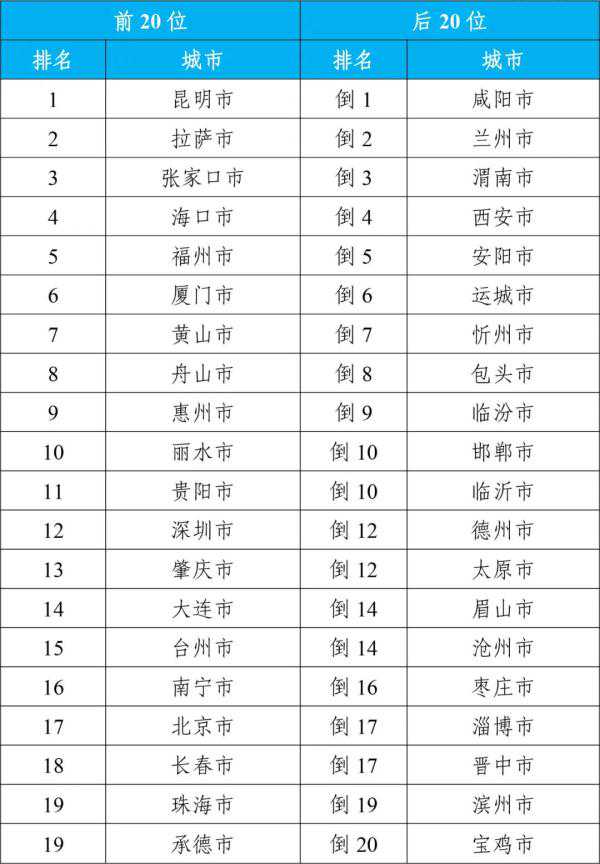 12月,168个重点城市中:空气质量排名前20位城市依次是昆明、拉萨和张家口等城市(从第1名至并列第19名);空气质量排名后20位城市依次是咸阳、兰州和渭南等城市(从倒数第1名至倒数第20名)。见附表1。