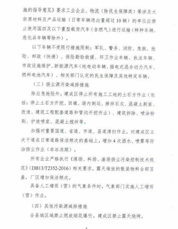 施工工地、工业企业厂区和工业园内禁止使用国二及以下的非道路移动机械(除清洁能源和紧急检修作业)、不达标的非道路移动机械,建筑垃圾和渣土运输车、砂石运输车辆禁止上路行驶。除城市运行保障车辆和执行任务特种车辆外,县城主城区内全天禁止重型和中型货车、三轮汽车、低速载货汽车(皮卡车除外)和拖拉机通行;营运小型货车(蓝牌)要遵守交管部门货车限行规定,按照规定时间路线行驶;以柴油为燃料的非道路工程机械停止使用。