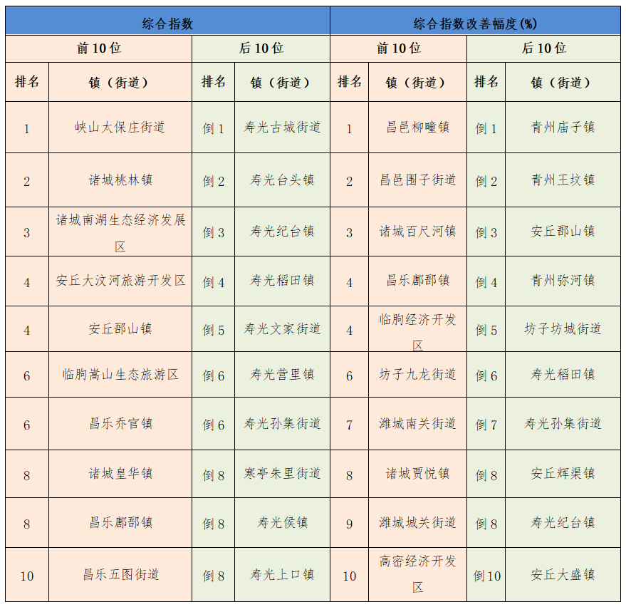 2022年,综合指数进入全市前10位的镇街是:峡山太保庄街道、诸城桃林镇、诸城南湖生态经济发展区、安丘大汶河旅游开发区、安丘郚山镇、临朐嵩山生态旅游区、昌乐乔官镇、诸城皇华镇、昌乐鄌郚镇、昌乐五图街道。