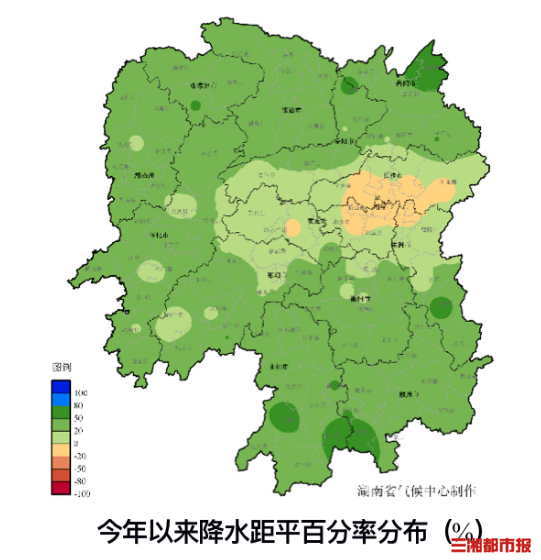 另据省气候中心统计,湖南各县市累计降水量在218.8毫米—653.3毫米之间。其中,道县、蓝山、临武、嘉禾、新田、炎陵、茶陵,以及张家界、南县、临湘、平江等11县(市)偏多达5到7成。