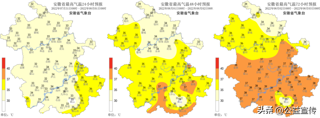 预计未来三天阜阳市、毫州市、淮北市、宿州市、蚌埠市、淮南市、滁州市最高温度将达到35~37°;黄山市、池州市、铜陵市、安庆市、宣城市、芜湖市、六安市、马鞍山市、合肥市最高温度将超过37°C。请注意防范!