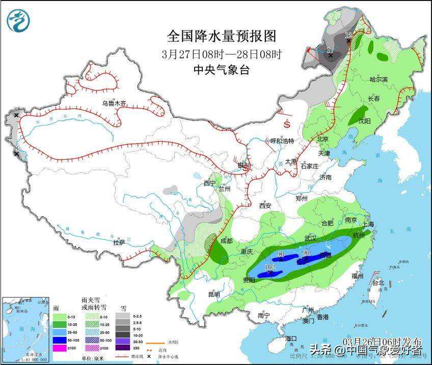 再次,随着蒙古气旋发展东移,水汽条件好的地方会出现降水,中央气象台预报中指出其中内蒙古东北部、黑龙江西北部,27-28日有大雪-暴雪。