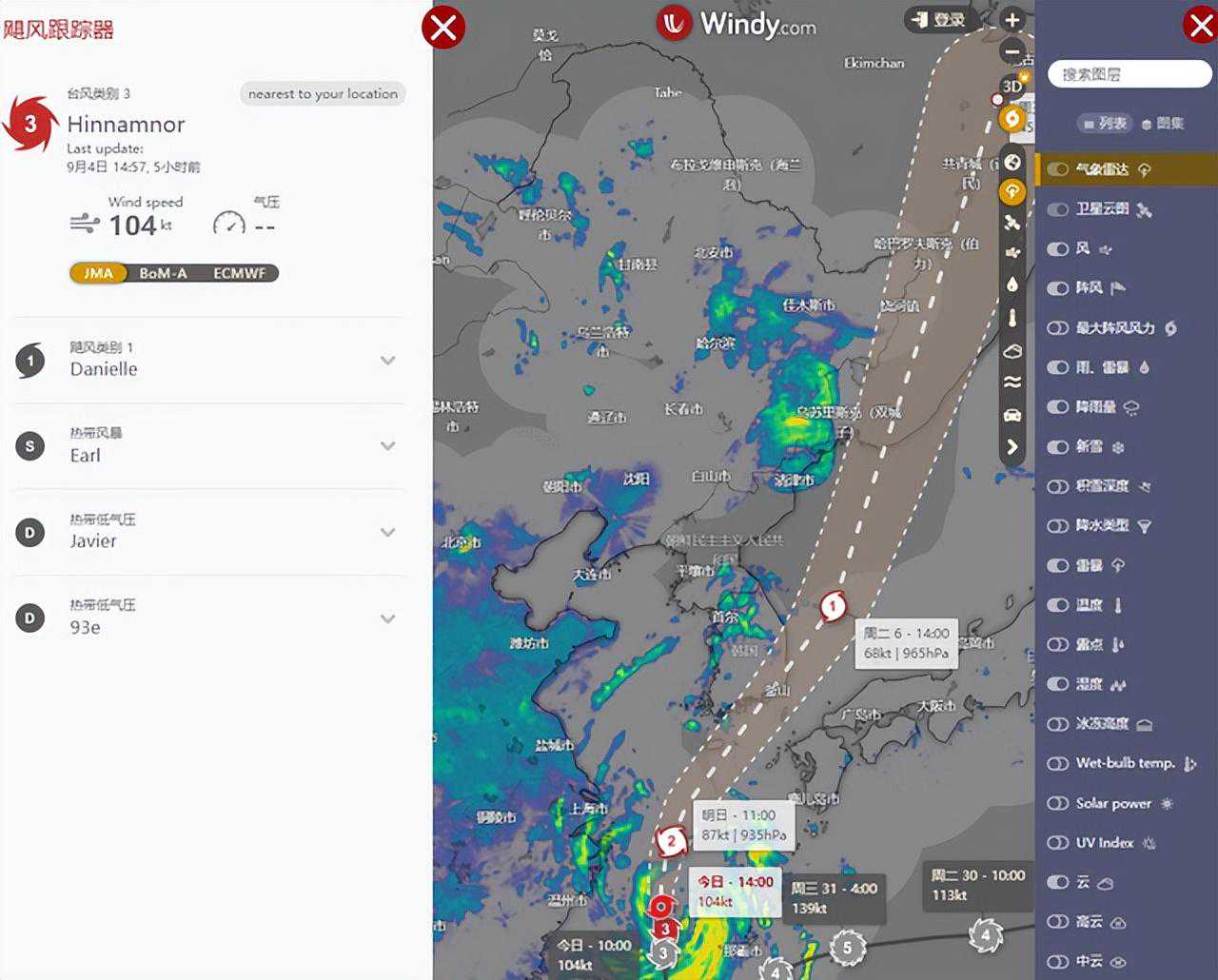 Windy也有台风路径预测功能,如果未来想知道台风行径路线,除了看新闻也能打开Windy网站,以可视化动态图方式来展示不同国家气象机构的预测结果,或有助于让我们更了解气候变化。