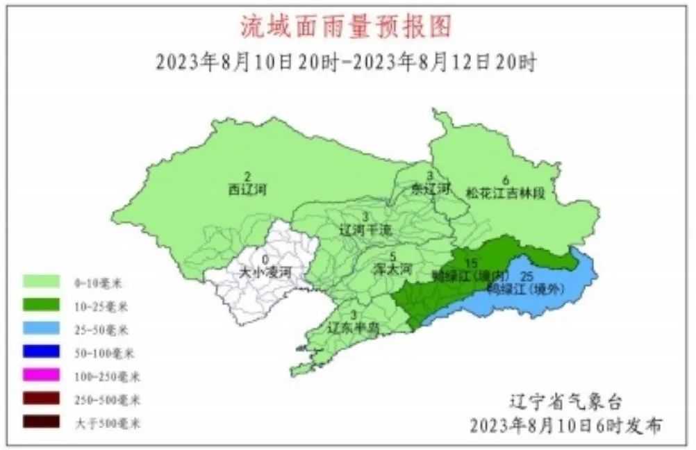 预计10~12日,我省上游的鸭绿江流域(境外)累计降雨量25~50毫米,局部可达50~100毫米,累计面雨量20~30毫米;鸭绿江流域(境内吉林东南部)累计降雨量25~50毫米,局部50~100毫米,累计面雨量10~20毫米。