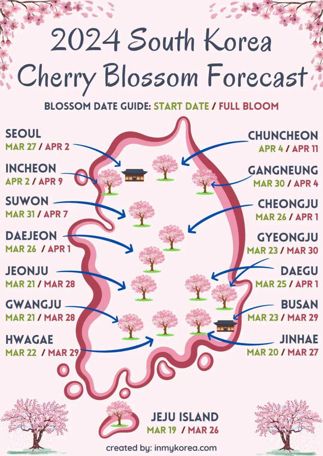 由于纬度的原因,韩国的樱花比日本会开的稍晚一些,花期一般在3月中旬到4月底,最早的樱花始于济州岛,然后由南向北经釜山一路绽放至首尔。