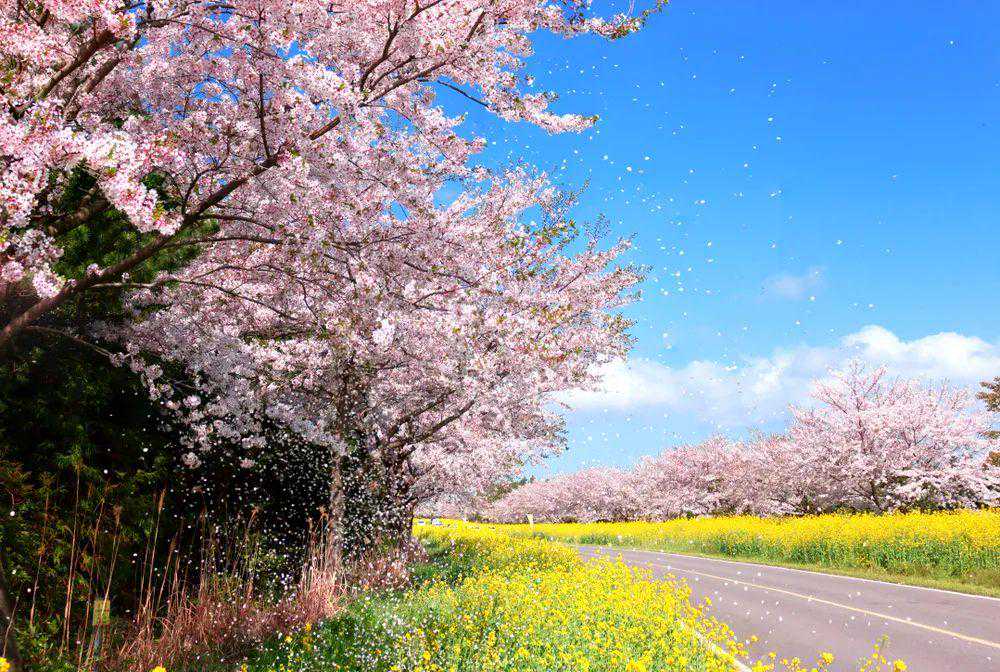 📍「鹿山路녹산로」:鹿山路位于济州岛的东侧,是韩国最美自驾公路之一。春日里这条路上的油菜花绵延近10公里,后面又有樱花作为背景,如在画中游一般。去这里搭乘公共交通并不太方便,建议自驾或包车前往。