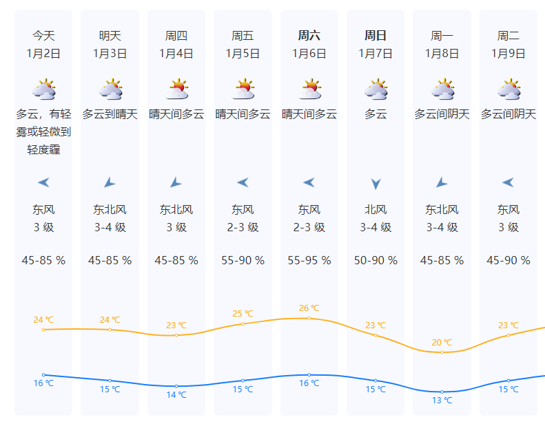 ·1月2日,深圳市大致多云,天气温暖,部分时间有轻雾或轻微霾,气温16-25℃。