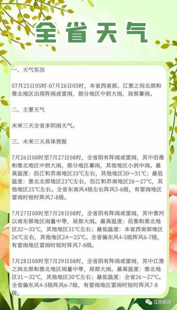 今天白天到夜里,宿迁、淮安、盐城北部和连云港部分地区有50毫米以上的强降雨,局地雨量可达100毫米以上,并伴有小时雨量40-60毫米的短时强降水和7-8级的雷暴大风。省应急厅(省减灾办)、省气象局提醒注意防范。