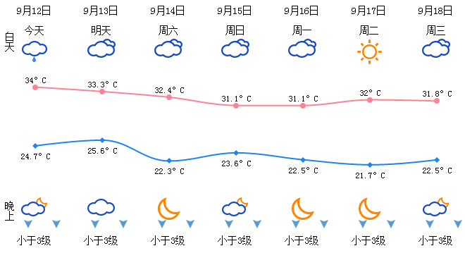 周五(中秋节):晴到多云,25~34℃