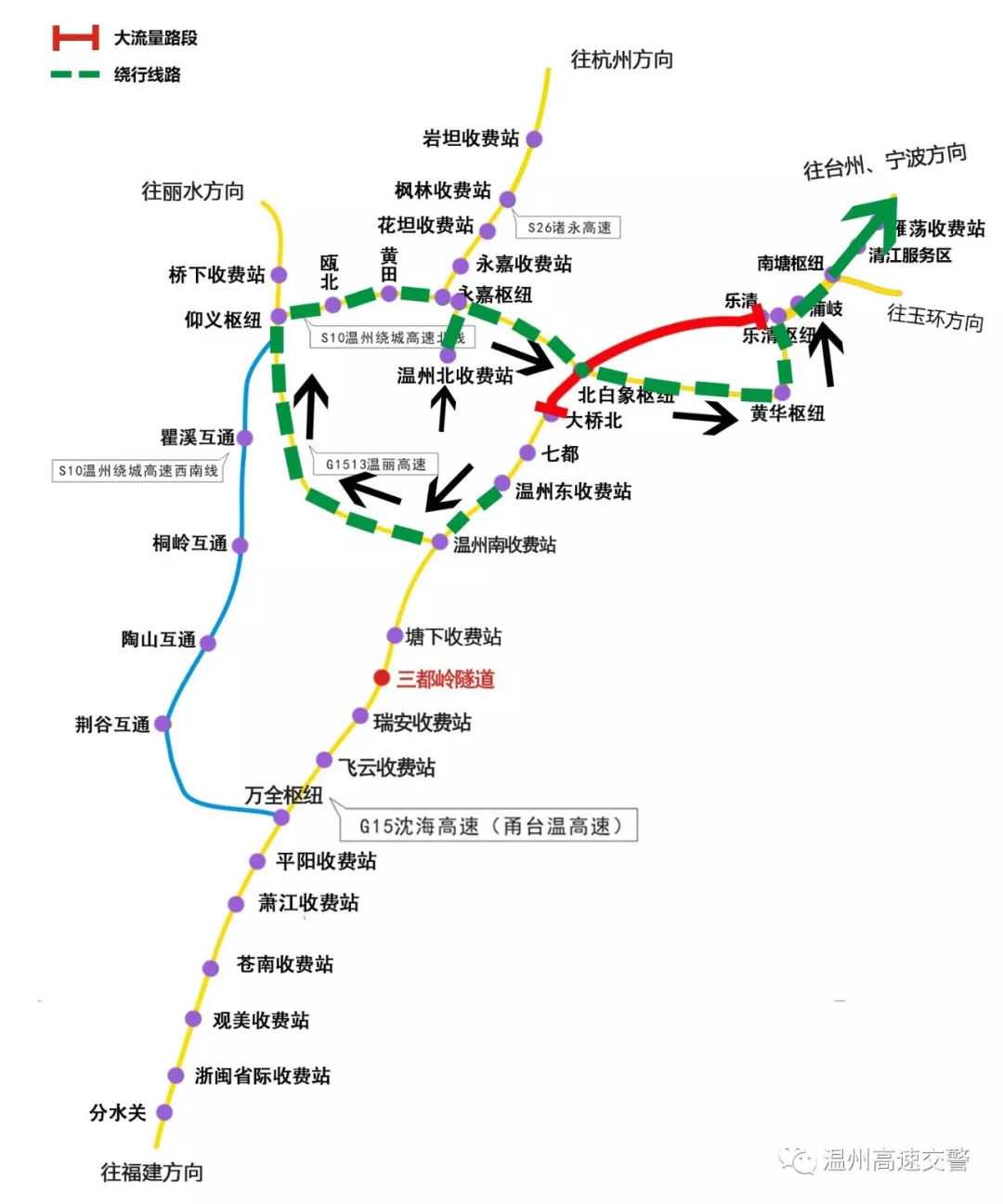 前往福建、泰顺方向的车辆,可选择从仰义枢纽S10转绕城高速西南线,经万全枢纽转G15沈海高速继续南下。往台州方向车辆可以在万全枢纽处绕行S10温州绕城高速西南线,经仰义枢纽转S10温州绕城高速北线。