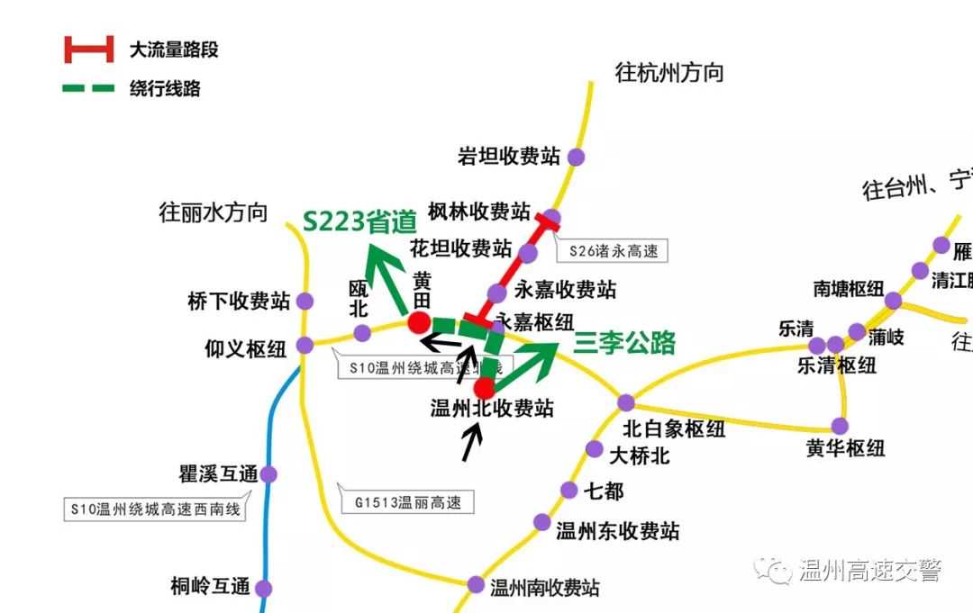 车流高峰期间,临近东瓯三桥片区前往永嘉的车辆,可选择在瓯北进入温州绕城高速北线转诸永高速。从龙湾前往永嘉的车辆,可选择在温州东上高速,经北白象枢纽进入温州绕城高速北线转诸永高速。