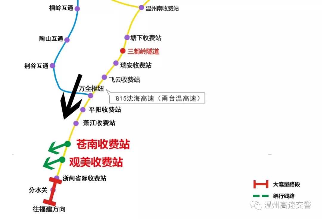 瑞安、平阳等地南下福建、泰顺方向的游客,如遇分水关路段拥堵,可提前在苍南或观美出口下高速选择104国道绕行。