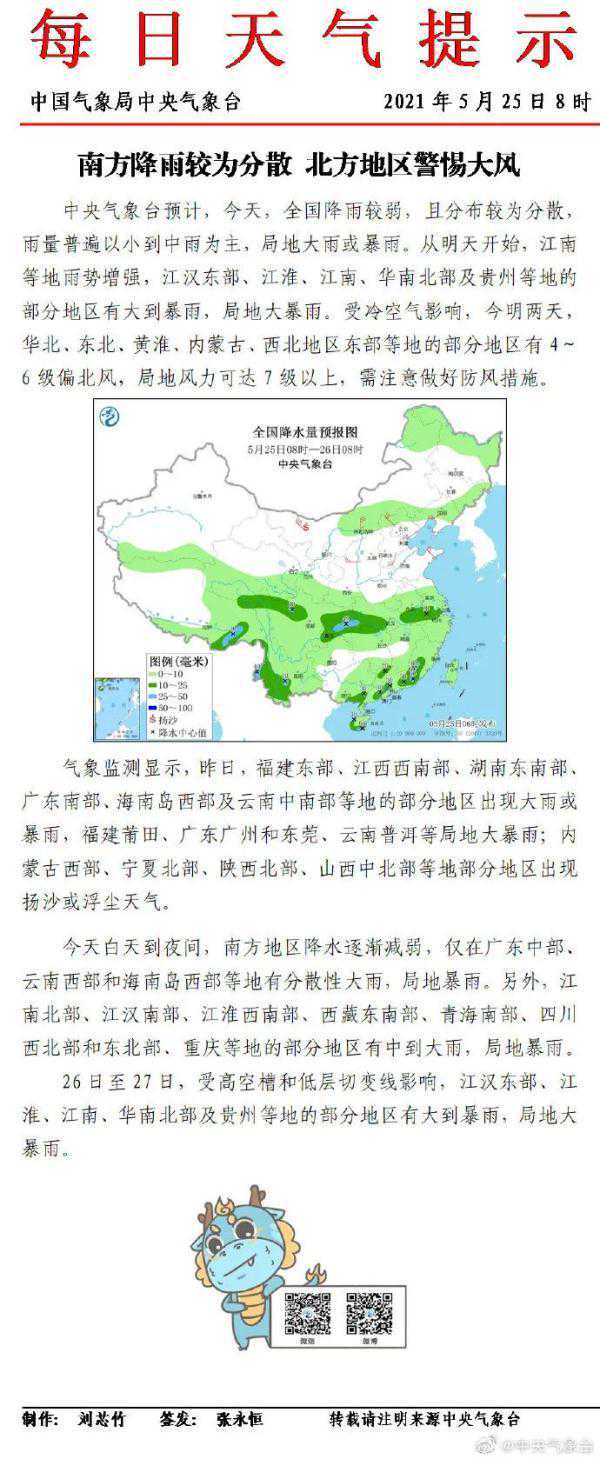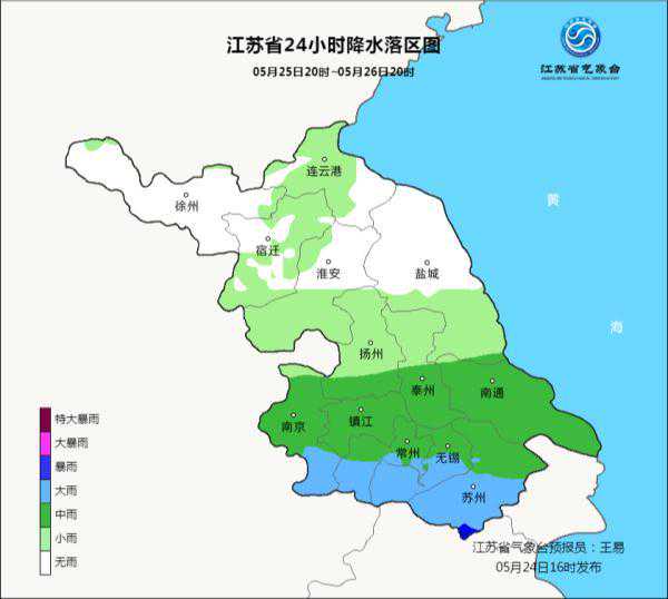 5月26日淮河以南地区阴有阵雨或雷雨,其中沿江和苏南地区雨量中到大,局部暴雨,其它地区多云到阴有分散性雷阵雨。