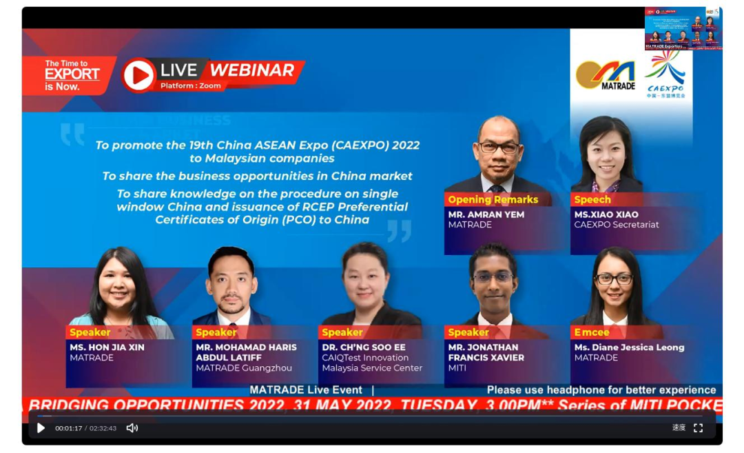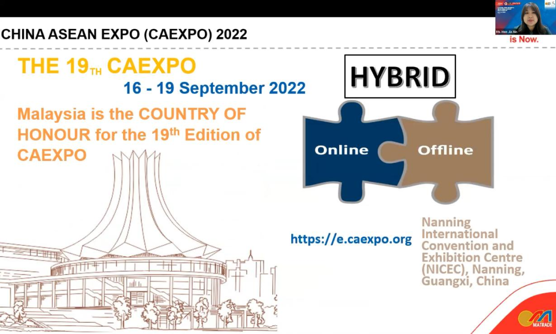 2022年5月20日上午,由马来西亚对外贸易发展局和中国—东盟博览会秘书处共同举办的第19届中国—东盟博览会(以下简称东博会)马来西亚推介会在线上成功举办。