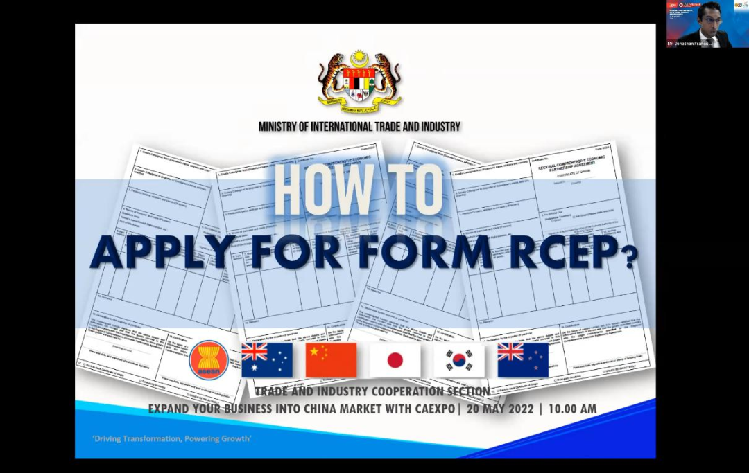 ▲马来西亚国际贸易与工业部贸易与工业合作处助理处长Jonathana/lFrancisXavier先生就申请RCEP优惠原产地证书(PCO)进行推介