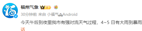 据福州市气象台预测,今天午后到夜里我市将有强对流天气过程,部分乡镇有大雨到暴雨(可能落区为闽清、闽侯、福清、长乐和永泰西部,并伴有雷电),4日部分县(市)区有大雨到暴雨,局地伴有强对流天气。