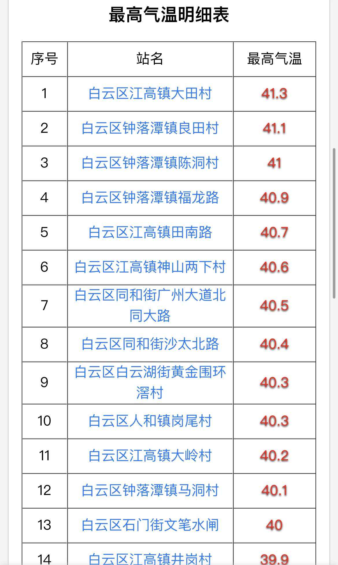 2022年07月25日14时50分一15时50分,白云区共有观测站43个,其中43个站点出现高温。全区最高气温为41.3摄氏度,出现在白云区江高镇大田村。白云区共有13个观测点的气温突破40摄氏度,分布在江高镇、钟落潭镇、人和镇、白云湖街、同和街以及石门街。