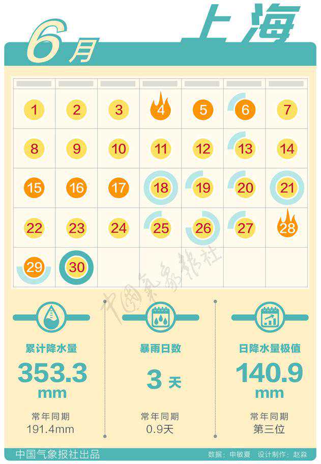 但是上海降雨可不小,累计降雨量达353.3毫米,比常年同期191.4毫米多83%。6月30日上海中心城区(徐家汇站)日降水量达140.9毫米,是1874年有记录以来6月日最大雨量的历史第三位,为近20年出现的最大暴雨。