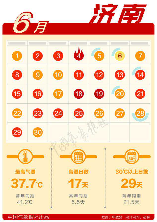 济南:6月,济南市区共出现17个高温日,位列历史同期第二位,第一位是1955年22个高温日。最高气温37.7℃,与有记录以来济南市区6月最高气温41.2(2009年6月25日)还差一点。6月35℃以上高温日数也未突破历史极值,但30天中有29天都是30℃以上。