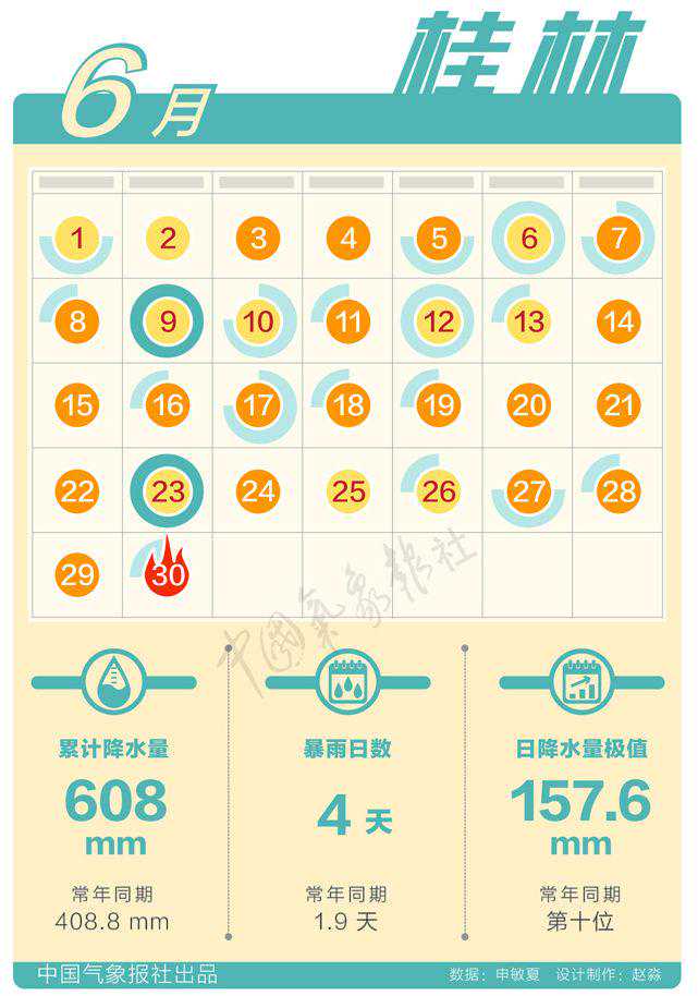 桂林:6月累计雨量大达608毫米,而且暴雨日数多,同时极端性很强。6月6日83.7毫米的日降水量、6月9日157.6毫米的日降水量、6月12日76.2毫米的日降水量,均打破同期历史记录极值。6月23日101.5毫米日降水量位居历史第二。