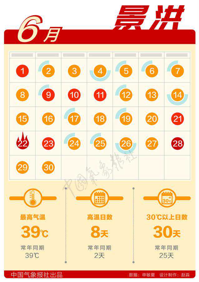 景洪:云南景洪高温日数为8天,为历史同期最多,比常年同期偏多6天;6月逐日最高气温均超过30℃,为历史同期最多;6月极端最高气温39℃,追平了6月最高气温记录。而且降水稀少:6月降水量65.6毫米,仅次于1961年和2012年为历史同期第三少年;6月无降水日数17天,为1961年以来同期最少。