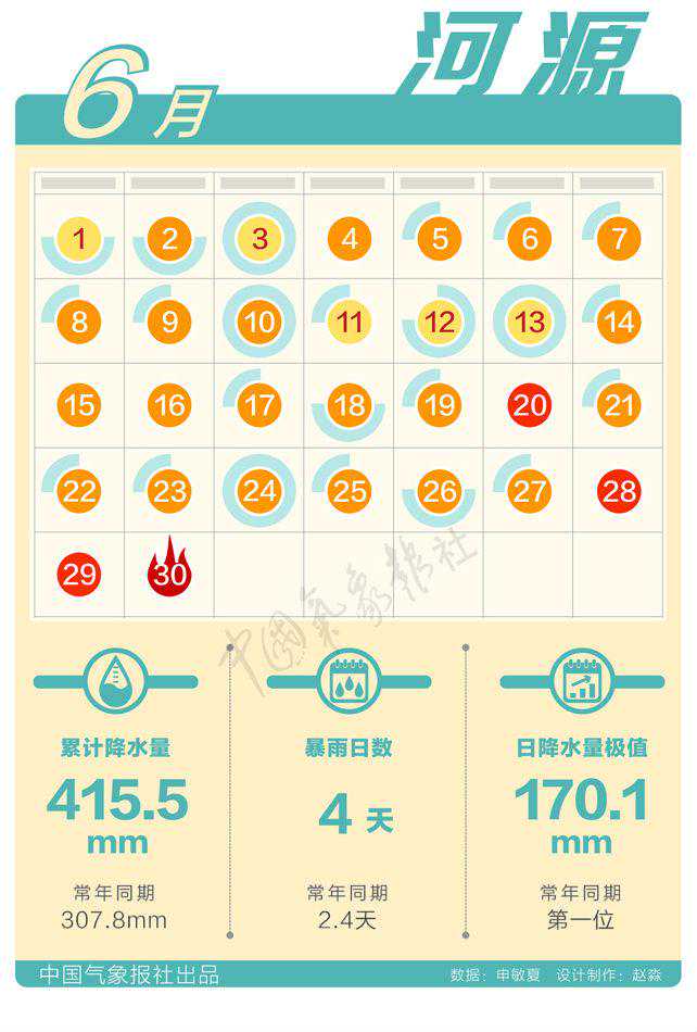 河源:广东河源6月累计降水量达415.5毫米,比常年同期307.8毫米偏多近35%,30天中有23天在下雨,其中暴雨日数为4天,比常年同期2.4天偏多。日降水极值170.1毫米打破历史记录极值。(专家顾问:舒文军马悦苏轶高帆蒋运志李蒙单雪珂记者申敏夏)