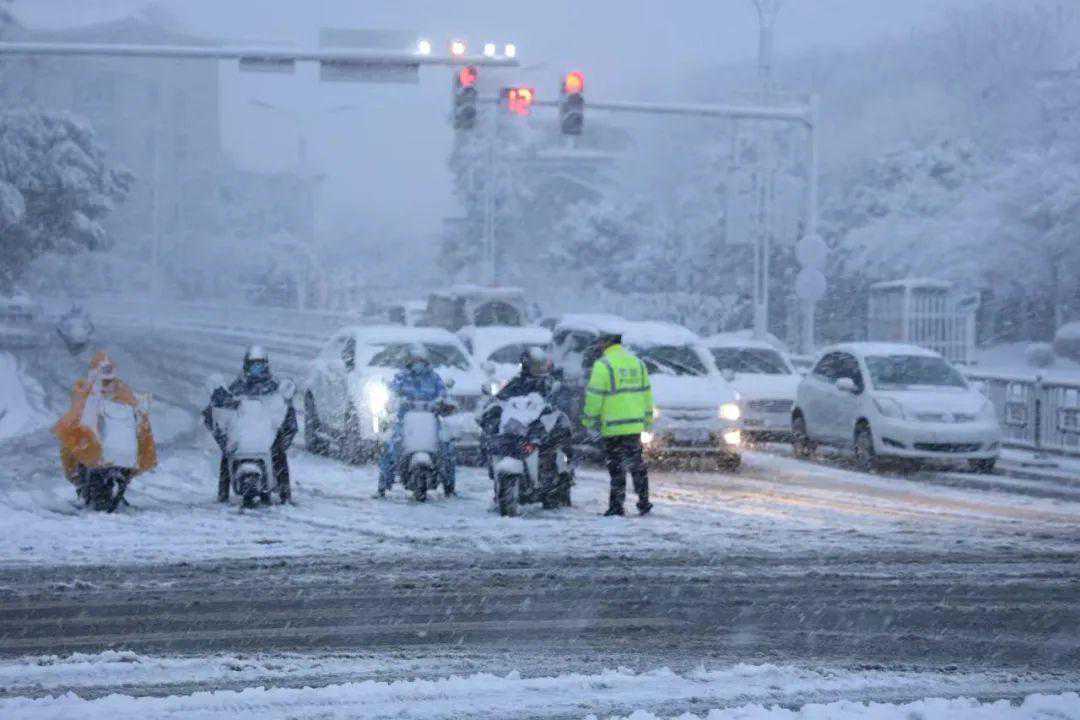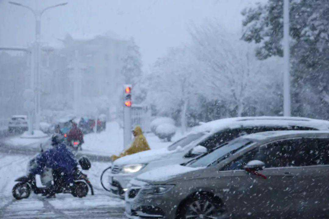 在十字路口,执勤的交警分外忙碌,他们维护秩序,还大声交代司机和行人,下雪注意减速,不要急刹车,也不要快速拐弯,避免发生意外。在大家的努力下,交通秩序井然。
