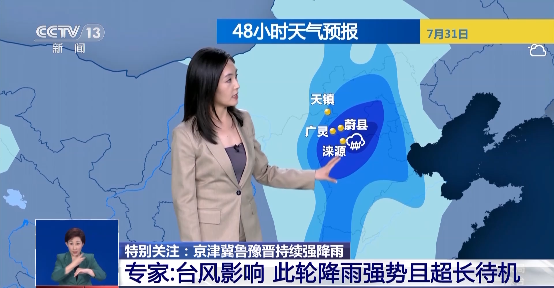 在31日的时候,它的系统减弱,但是第六号台风卡努靠近通道打通,给刚要结束的降雨又补充了水汽,所以整体导致华北这次的雨将会是超长待机,包括北京可能一直要到8月2日才能结束,强降雨时段在周日以及周一两天还是会非常的明显,包括石家庄、天津也都是如此。