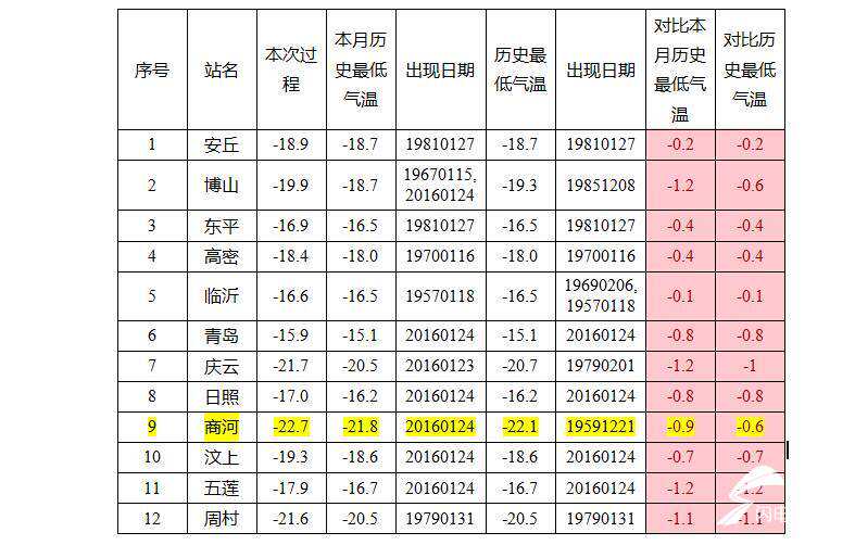 山东省气候中心数据显示,全省共有12个大型监测站监测的最低气温超过历史极值,为商河、庆云、安丘、博山、东平、高密、临沂、青岛、日照、汶上、五莲、周村。