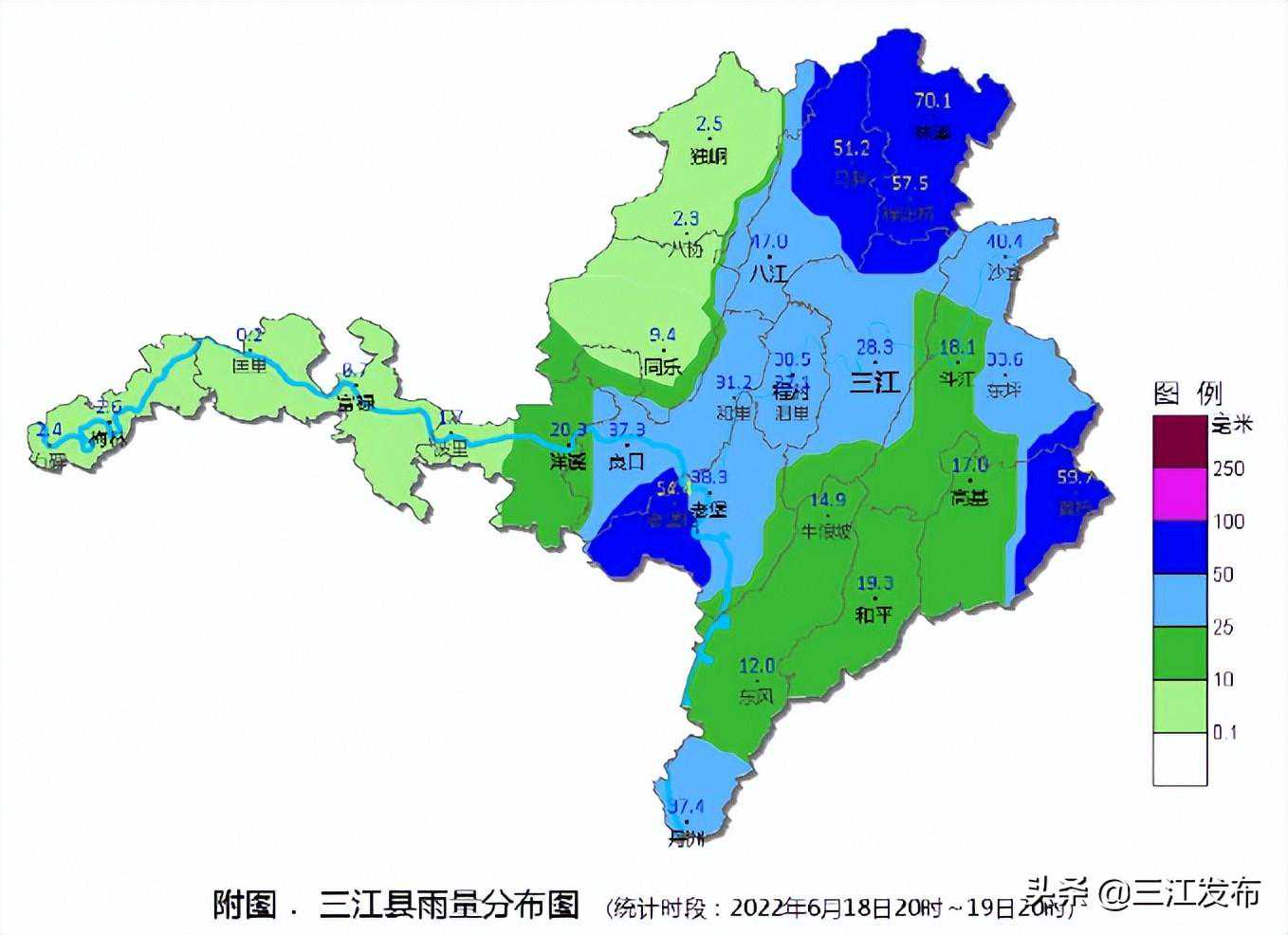 2022年6月18日20时—19日20时,受高空波动及西南急流共同影响,我县出现了中到大雨、局部暴雨。根据自动气象站资料统计,共有5个站出现了暴雨,10个站出现了大雨,最大雨量70.1毫米(林溪镇),最大1小时雨量26.5毫米(良口乡,19日20时)。