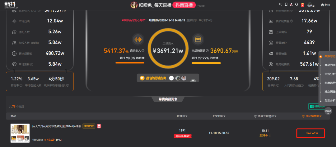 以美妆博主呗呗兔为例,11月10日直播预估销售额3691万元,其中的爆款Top1就是后天气丹,预估销售额567万元。