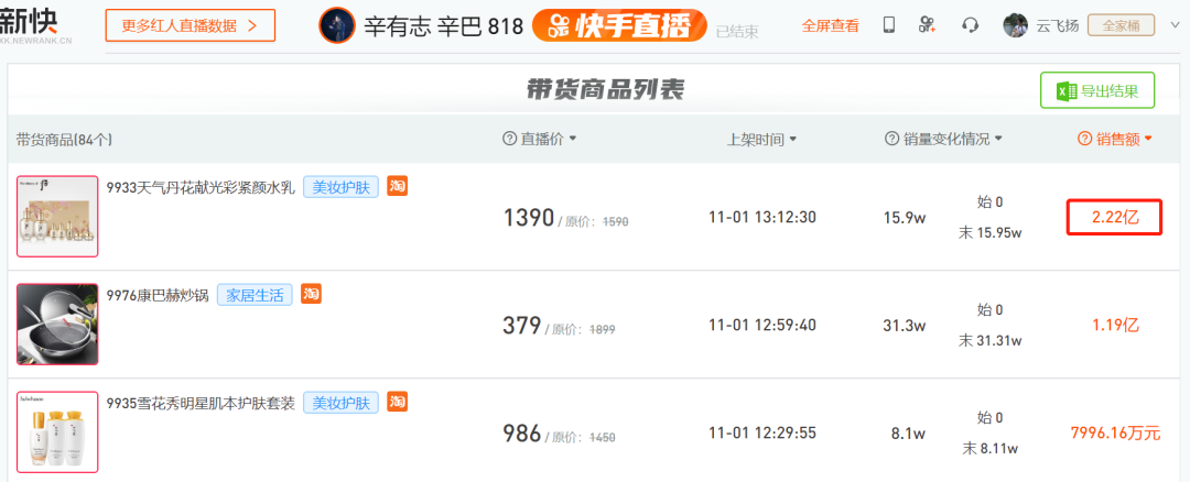 除此之外,在岳老板11月10日的首场破亿直播中,后天气丹贡献了除苹果11、黄金之外的最大销售额254万元。