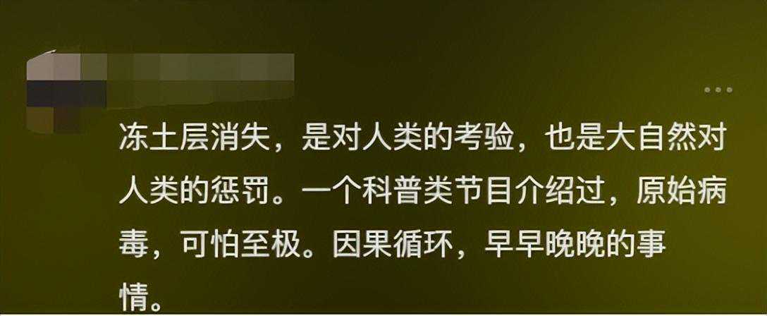 “冻土层消失,是对人类的考验,也是大自然对人类的惩罚。一个科普类节目介绍过,原始病毒,可怕至极。因果循环,早早晚晚的事情。”
