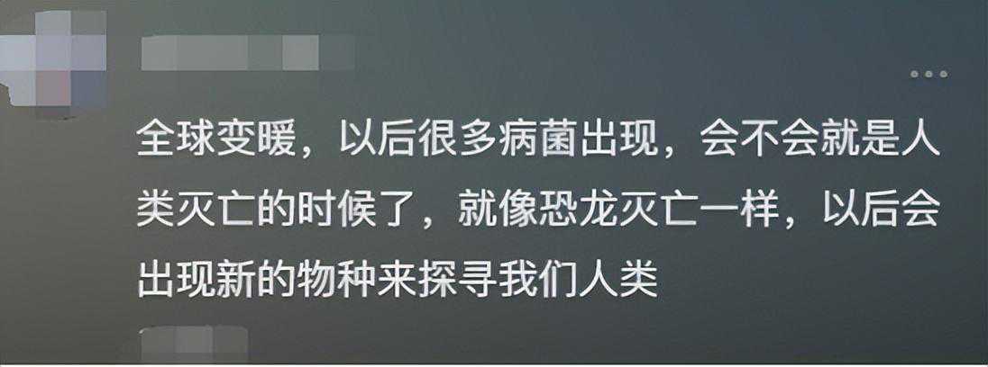 “全球变暖,以后很多病菌出现,会不会就是人类灭亡的时候了,就像恐龙灭亡一样,以后会出现新的物种来探寻我们人类”