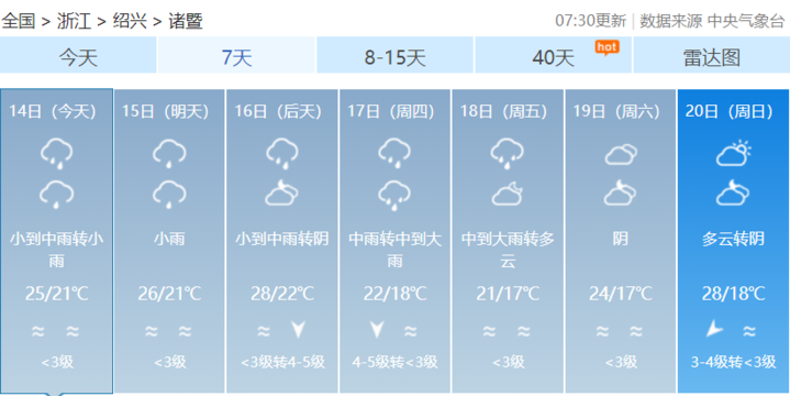 据天气预报来看,从今天起,诸暨就有小到中雨转小雨;15-18日前期我市都是阴有阵雨的天气。