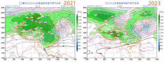 △左图为2021年11月8日地面气压场,右图为2023年11月6日地面气压场。