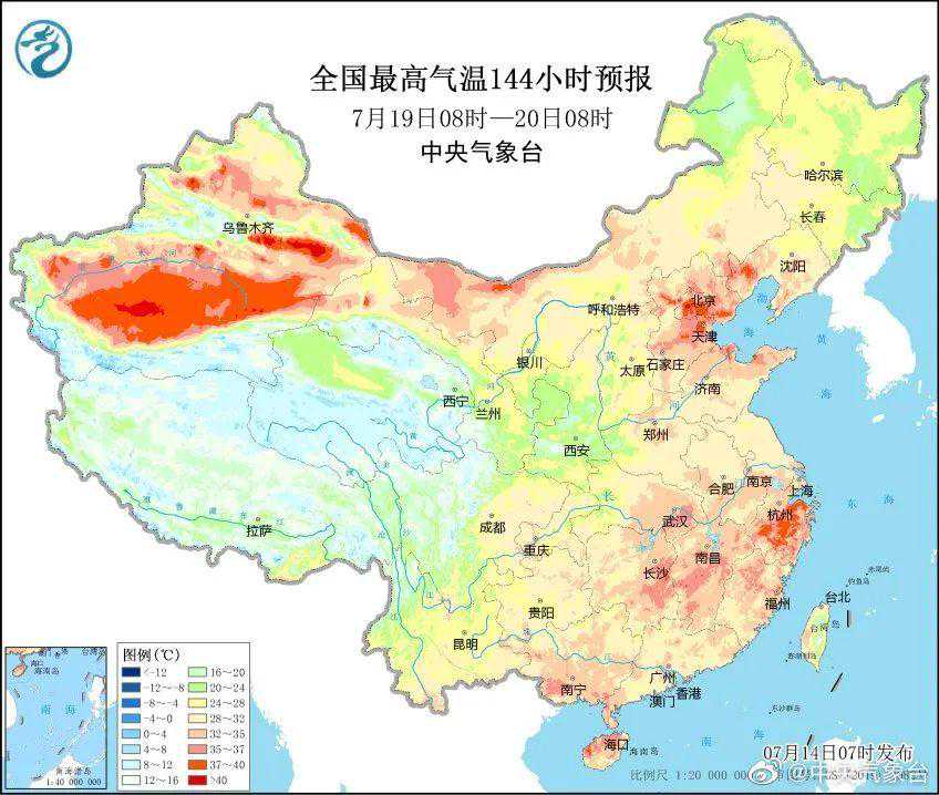 预计7月14日白天,陕西南部、河南中南部、四川东部、重庆、江汉、江淮、江南、华南等地有35℃以上高温天气,安徽中南部、江苏中南部、上海、湖北、湖南中北部、江西、浙江、福建、四川东部、重庆、贵州东北部等地的部分地区最高气温37~39℃,江苏南部、浙江中北部、四川东南部、重庆、陕西南部等地局地可达40℃以上。