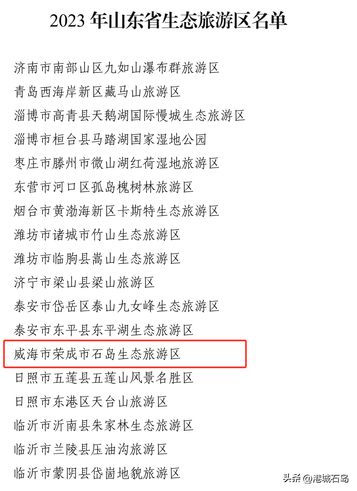 近日,省文化和旅游厅、省生态环境厅确定全省20家单位为2023年山东省生态旅游区,荣成市石岛生态旅游区荣登榜单,位列其中。