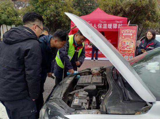 湖南人保财险“温暖驿站”工作人员为出行群众免费添加防冻液、玻璃水并提供车辆安全体检。