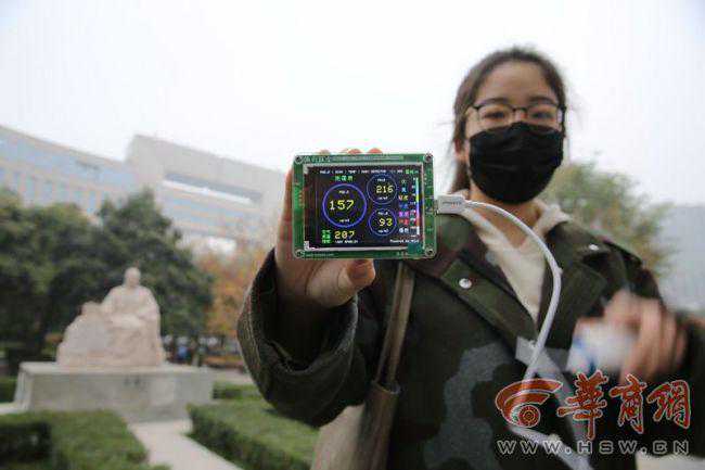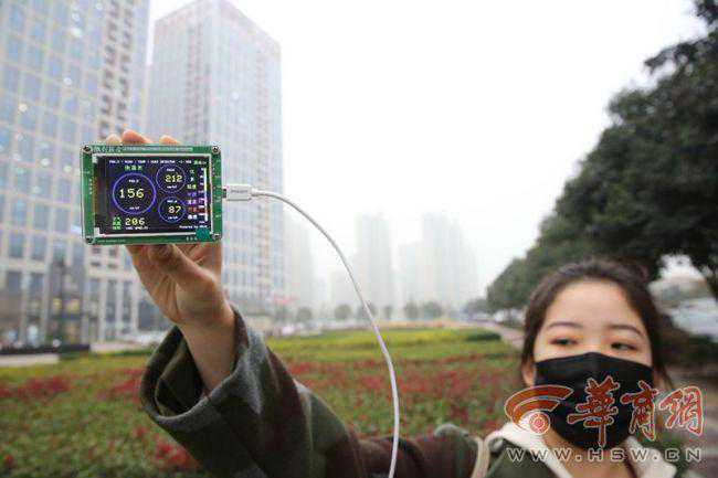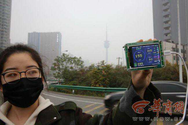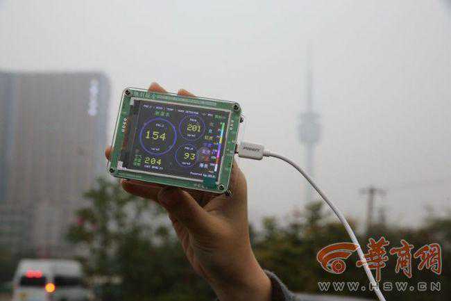 11月14日下午,记者带着测霾仪外出测霾。在陕西师范大学长安校区门口,测出AQI为210,属重度污染,主要污染物为PM10和;长安区政府门口,测出AQI为202,主要污染物为PM10和;在绕城高速长安路收费站口,测出AQI为207,电视塔笼罩在雾霾之下;旺座曲江门口,测出AQI为201。均属重度污染。记者任婷实习生王璧君摄影邓小卫
