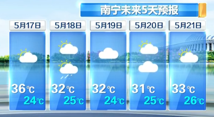 南宁市气象台预计,昨晚到今日白天,南宁城区多云,局地有阵雨或雷雨,偏南风2级,最低气温24℃,最高气温36℃。