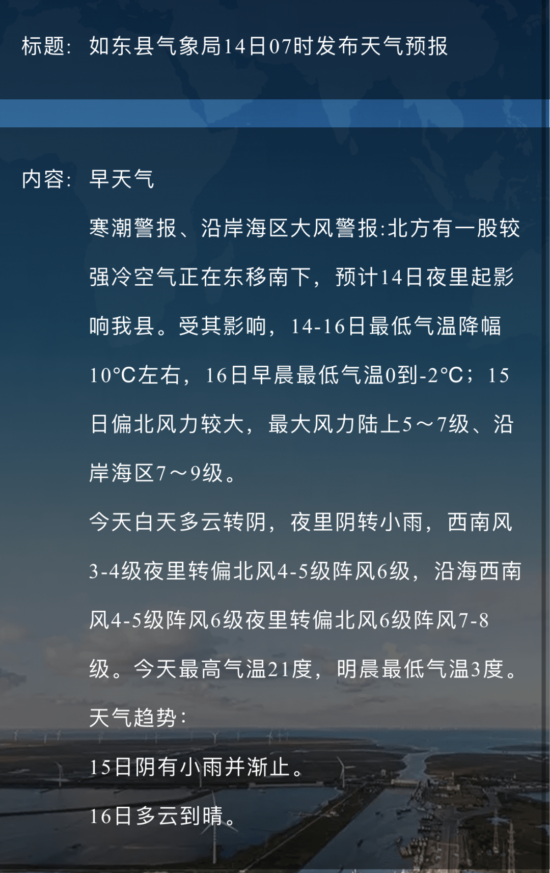 寒潮警报和沿岸海区大风警报