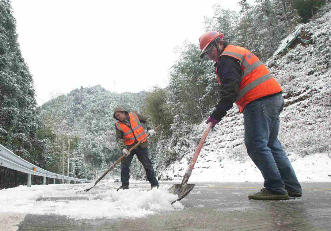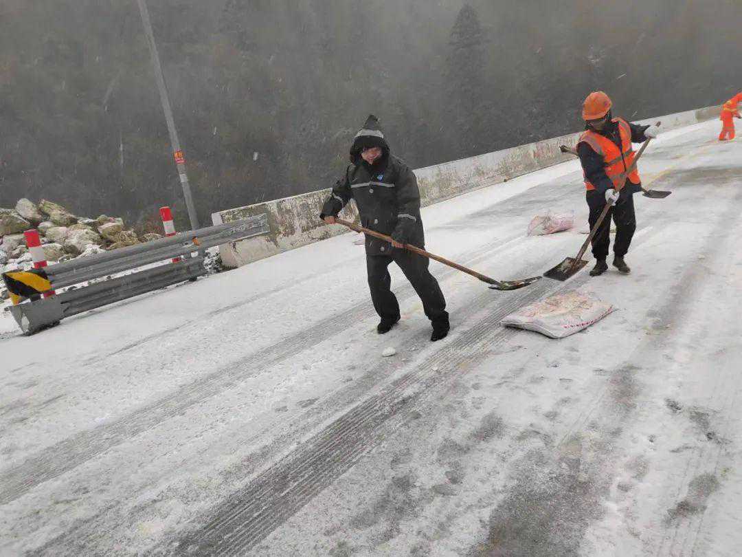 ▲公路养护部门及时组织人力到安太乡实行机械、人工铲雪融冰,保障道路安全畅通和群众出行。