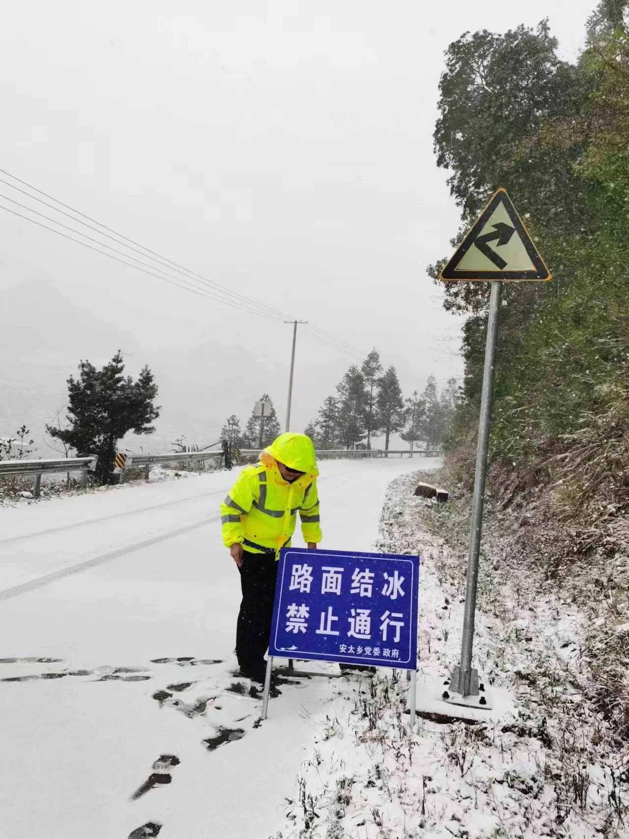 此外,乡交通管理站对极易结冰的交通要道安太隧道路段、元宝山脚等,及时行动开展公路安全隐患排查工作,随时跟进查看路面结冰情况,设置交通警示标志,对已结冰无法通行的路段实行封路值守,确保过往车辆道路交通出行安全。