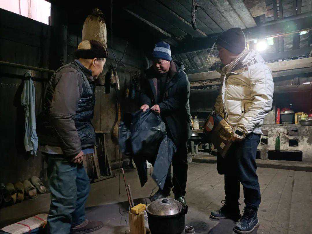 ▲工作人员看望独居老人并发放防寒物资。