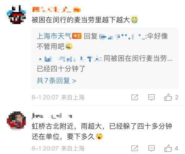 根据上海中心气象台统计,8月1日19时至23时降雨量,7个街镇超过100.0毫米,