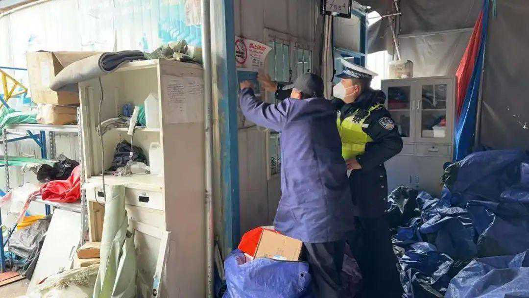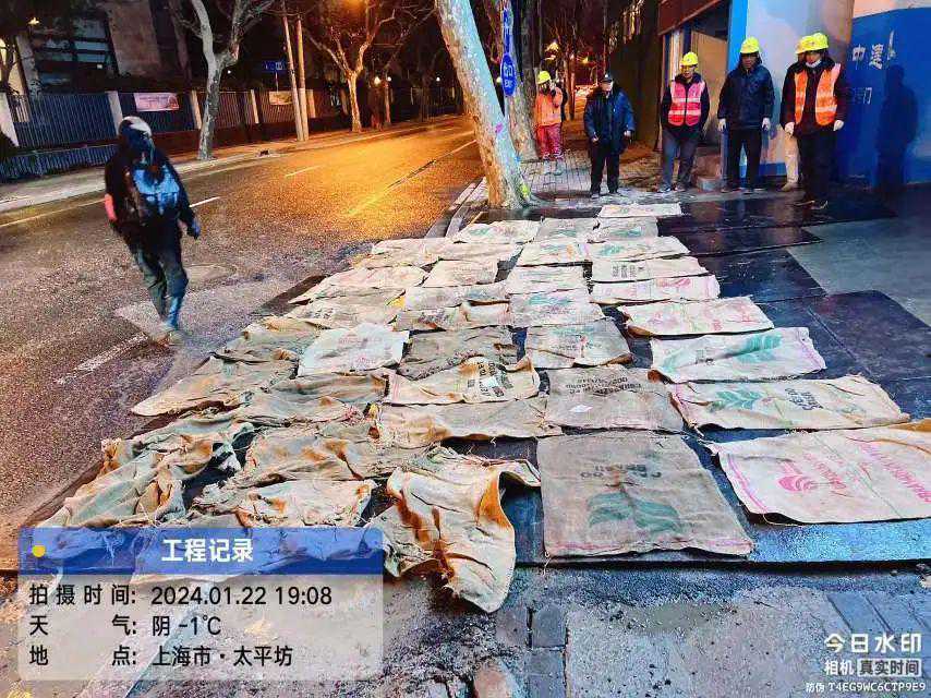 在发现道路结冰路面的第一时间,静安公安分局交警支队民警会同养护单位开展撒盐融冰措施。22日夜间,在康定路上的一处工地附近出现了结冰情况,交警及时铺设沙袋、草垫,确保行人车辆通行安全。